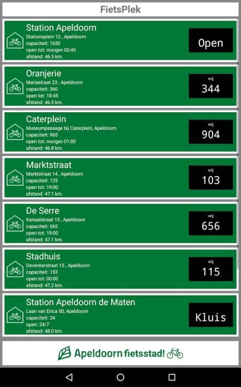 This app lets you see the bicycle is in the municipality of Apeldoorn, where they are and how to get there. You can see exactly how much space each bicycle parking is available.