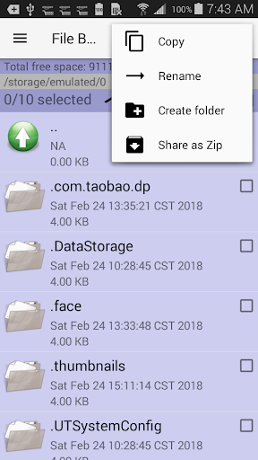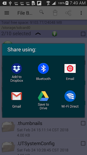 The app allows you to select multiple files/folders and delete them with a single tap. Selected files and folder can also be shared with friend by sending them by email, or putting it in Google cloud. You also have the option of putting multiple files and folders in a single ZIP file and sending them via email.
