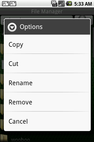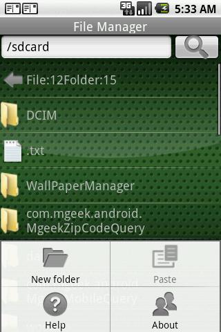 Need help with management of your SD card files? File Manager can do this for you.features: Look up files, play audio amp video files ,view image amp; html files, etc Create as well as copy, paste, cut, rename, remove files amp; folders recognition of the .apk files amp; user can install .apk file manually