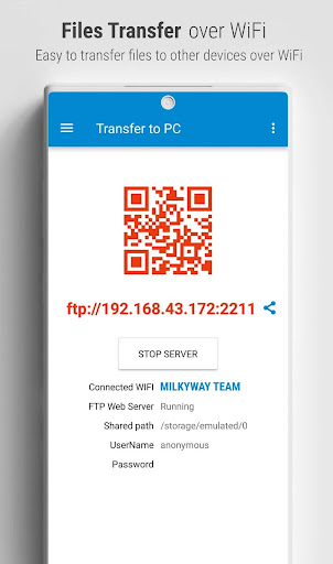 You can transfer files to any other devices connected to the same WiFi network without USB cable and PC. Once you connect to WiFi and sharing your files, any other devices like other Android phones, PC, tablet or iOS phone can access and download.