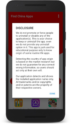 We do not promote or force people to uninstall or disable any of the application(s). This is your choice to keep or uninstall the app. even we do not provide any uninstall option in it. This app is just used for educational purpose only to know the origin country of some routine life apps installed in user device.