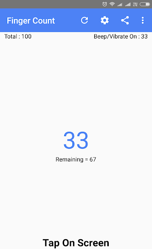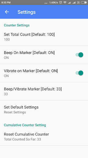 2. Beep/Vibrate Mark - When counter reaches multiple of this number, device gives a beep/vibrate notification. For example if total count is 100 and beep/vibrate mark is set to 33, than the App gives notification when the completed count reaches 33, 66 and 99. Marker number is editable in the settings Page. Beep and/or vibrate notification can be enabled/disabled in the settings page. It works same as a intermediate stopper in the tasbeeh count.