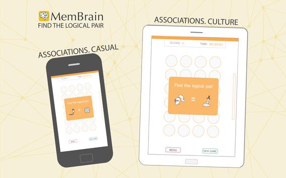 The main principle of the game MemBrain is based on famous pairs match game, where you need to find and match two identical images. However in MemBrain you'll need not only to recollect the position of the passing cards, but also find the main feature that unites them, what increases your spatial intelligence.