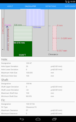 The calculator works in line with ISO 286-1 (2010), ISO 286-2 (2010) and ANSI B4.2 (1978) standards which are based on metric units. According to the input parameters of nominal size and hole/ shaft tolerances, size limits and deviations for hole/shaft are calculated and fit type is selected among the clearance, transition and interference fits.