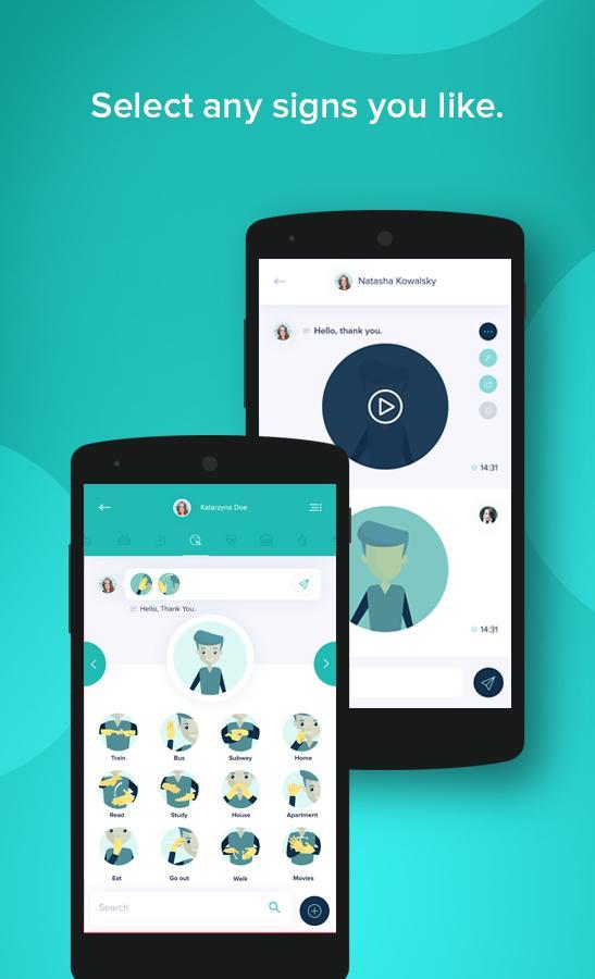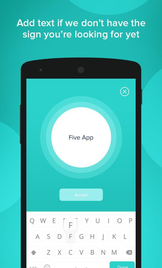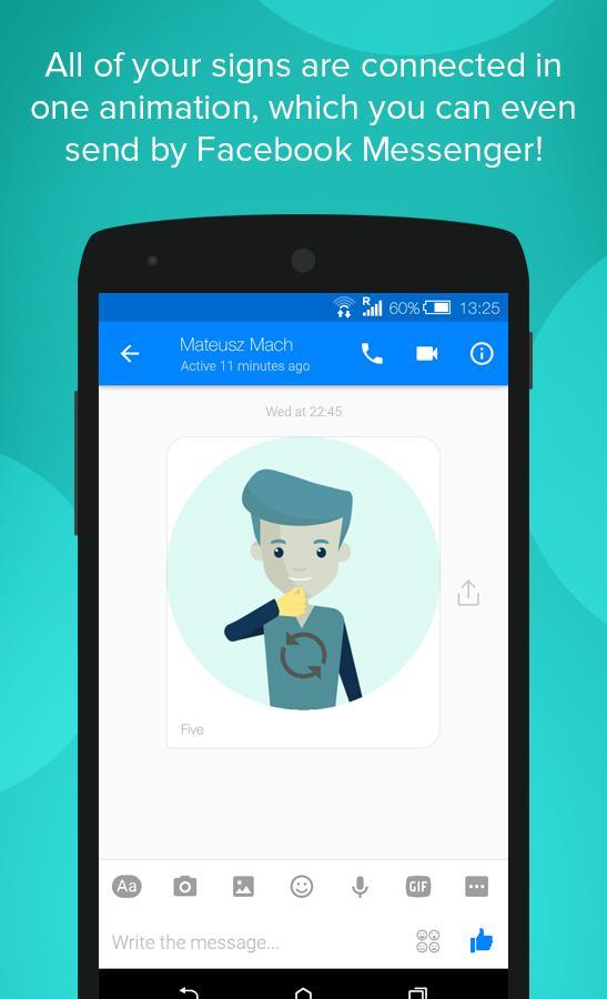 Send animated sign language messages in ASL to your friends with Five App! Using a base of more than 800 animations you can use Five App to sign anytime: send messages to your friends using Five App itself, or even Facebook Messenger. After months of work together with sign language specialists, led and inspired by Deaf sign language users, we have developed a system which lets you easily construct sentences using particular animations and facial expressions to bring the full power of sign language to the digital messaging world. If the sign you are looking for is not implemented yet, you can add text to your message too!