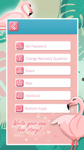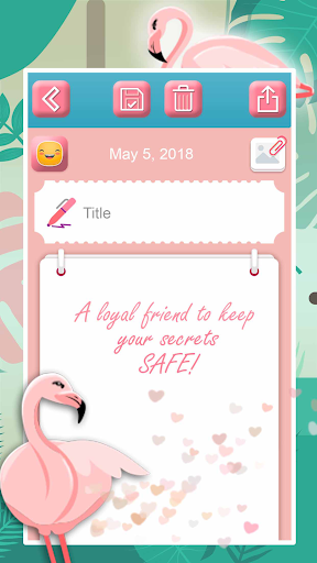 🌸 is here! Write about your important moments and your secret crush in a “secret diary” with a fingerprint lock for girls, hide photos and more! It's my personal diary to write my secret! All your private thoughts are stored safely in a "journal" and pink diary with lock password for girls! Write your own love story in a love diary with password! A loyal friend that will keep your secrets safe - "diary with lock" ! Add new entries whenever you want in a diary for teenage girls! The adorable “flamingo” lock diary for girls will protect your stuff! Write a diary and all your special wishes in a secret diary with camera! Customize your phone with stunning flamingo backgrounds for secret diary books for girls with lock and a dream journal! It's a “princess diary” with password to keep your deepest secrets hidden!