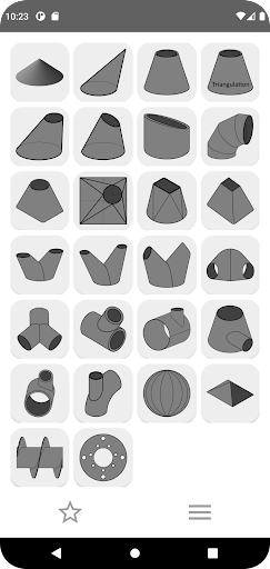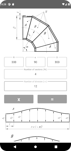 Calculator will calculate the necessary dimensions for the construction flat pattern segments lobsterback bend, elbow , tee piece, frustum cone and truncated pipe, truncated cone with an accessible vertex and triangulation method, Truncated Pipe Layout or Pipe cut at any angle Flat Pattern, Pipe to Cone intersection at Perpendicular to Axis Flat Pattern, Pipe Truncated by Radius Flat Pattern, Full Cone Layout Flat Pattern, Rectangle to Round or Square to Round Transition layout Flat Pattern, Round to Rectangle or Round to Square transition layout Flat Pattern.