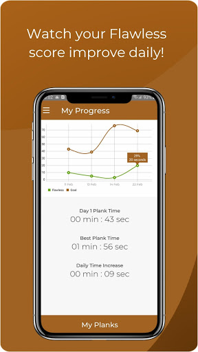 You can also set a 30 day plank challenge - we calculate the daily plank target time, keep track of each day's plank target and your flawless scores. You can see your daily improvement in a visual graph.