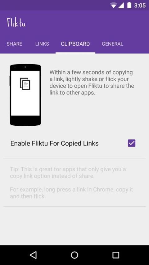 Within a few seconds of copying a link, gently flick or shake your device to open Fliktu to share the link to other apps.