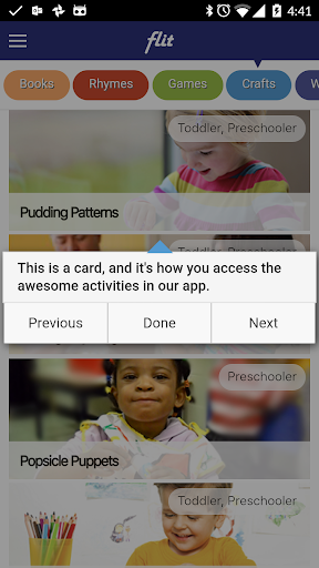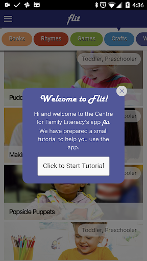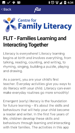 Flit is an app produced by the Centre for Family Literacy that helps families promote a healthy environment that fosters literacy by providing activities and tips for encouraging literacy in their children. Parents will find specially tailored and curated activities ranging from reading, recipes, rhymes and games specifically designed to build strong reading, writing and literacy skills in their child and have FUN doing it!