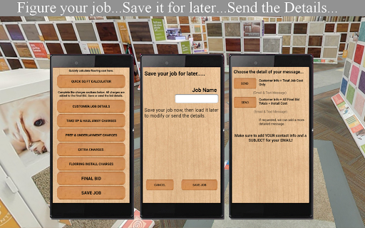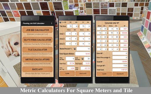 This app incorporates many of the different types of costs associated with flooring installation. You can calculate a flooring bid that includes Ceramic Tile, Hardwood Floors, Carpet, Vinyl, Laminate Flooring, and others.