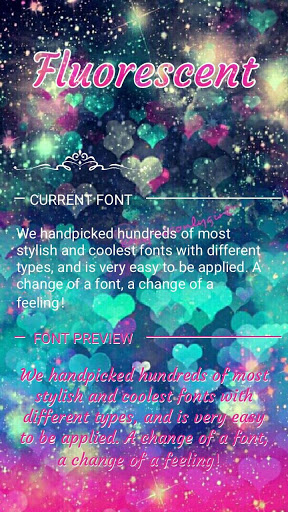 Hundreds of selected fonts style from handwritten fonts like Fluorescent, such as cute, darker, comic, galaxy, love, pink, sexy written, colorful fonts, clean fonts, candy fonts, etc. Do not wait, just download a font which you like best. And it is compatible with the font program on your phone! 👏👏❤❤🌹🌹