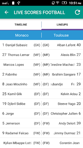 - Match line up with players names, numbers and their positions.