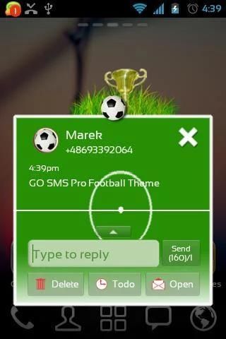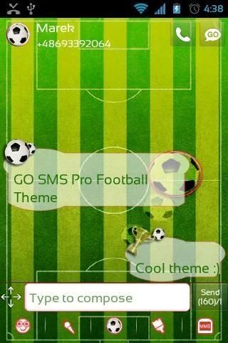 Do you love football? Select the theme and enjoy your passion every time you turn on the screen. Application for sending text messages looking like perfectly reproduced playground for football. The screen is dominated by lush, deep green and the grass has looking like a real stripes and white lines of the field. Sms texts are white, they have a football theme. Conversation windows are white and slightly translucent. Windows sms texts are green. The window for incoming text messages contain a football field, and on the grass, football and the World Cup trophy. Incoming sms text is white and has elements in same color.