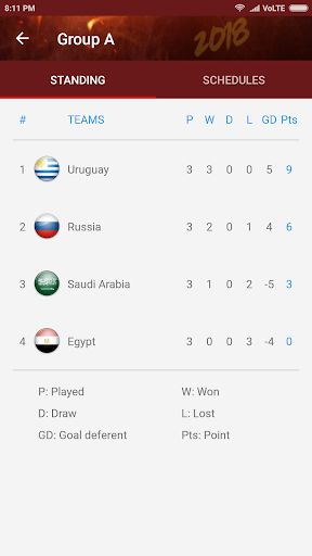 Follow the matches of your favorite team from list. Russia, Saudi Arabia, Egypt, Uruguay, Morocco, Iran, Portugal, Spain, France, Australia, Peru, Denmark, Argentina, Iceland, Croatia, Nigeria, Costa Rica, Serbia, Brazil, Switzerland, Germany, Mexico, Sweden, South Korea, Belgium, Panama, Tunisia, England, Colombia, Japan, Poland, Senegal.