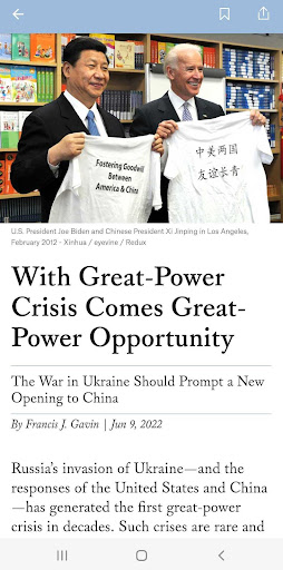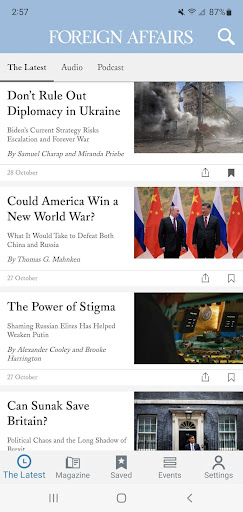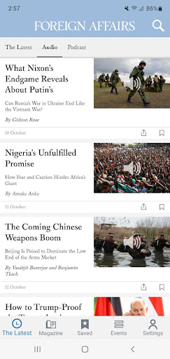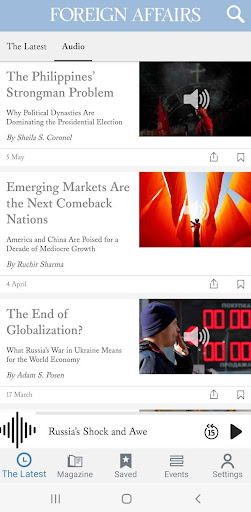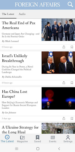 Download the Foreign Affairs app to stay up-to-date on the latest international news, commentary, and analysis from influential thinkers and world leaders. The Foreign Affairs app offers insightful articles, digital issues, podcast episodes, videos, and audio content optimized for an ideal experience on Android mobile and tablet devices. Users can access new, relevant articles on international topics of interest daily at no cost. Subscribers get additional access to digital magazine issues.