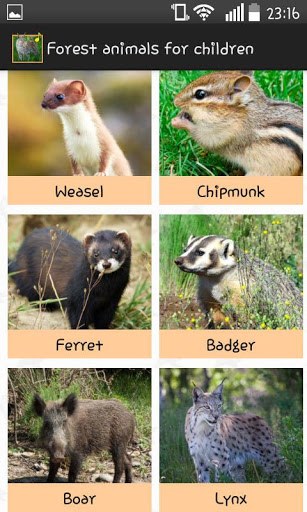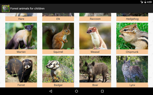 - This interactive encyclopedia for children tells about the following animals: Bear, Fox, Wolf, Roe, Hare, Elk, Raccoon, Hedgehog, Marten, Squirrel, Caress, Chipmunk, Polecat, Badger, Boar, Lynx.
