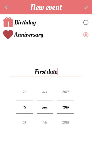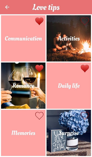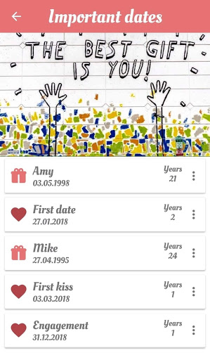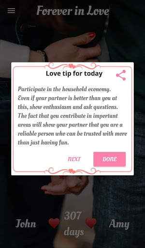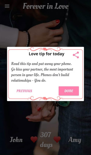 Select between a variety of tips and receive them at a time you choose! The love days counter also keeps track on how many days you have been in love. The reminder will make sure you remember all those important days, be it a 10th year anniversary or your first kiss!
