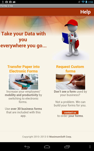 Replace your Paper or Computer forms with similar forms that are available at your Fingertips. Store any form-based information directly on the tablet, and access it anytime, anywhere. Your critical information won't get misplaced, misfiled, or become log-jammed.