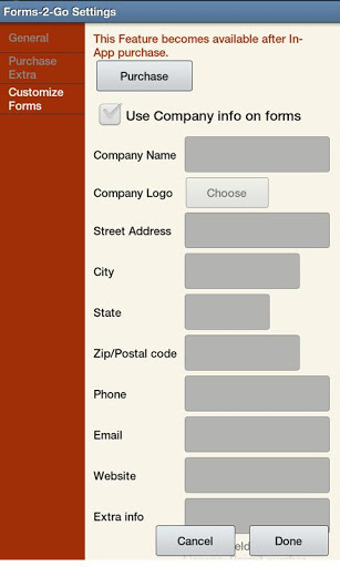 - Pre-build forms can be customized with your Company name, logo, address and contact information (requires in-app purchase).