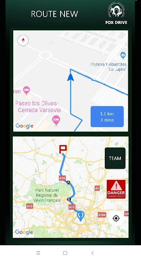 More cars synchronize and move simultaneously from a starting point to a destination point. Each car will show the rest of the team its position on the map, and via the "Team" button you will be able to see the distance in km between car "A" and "B" or from other cars.