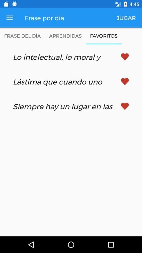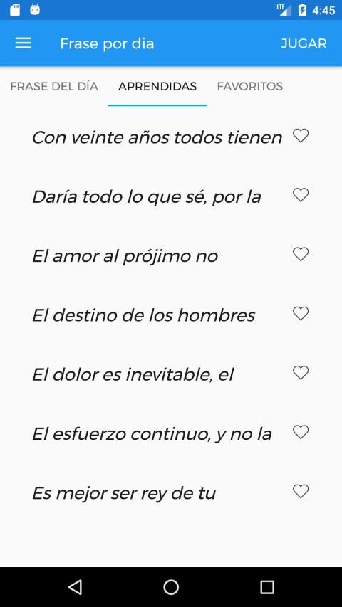 Vas a poder ver el listado de las frases ya aprendidas con sus autores y a su vez vas a tener un listado con todas tus frases favoritas para consultarlas cuando quieras!
