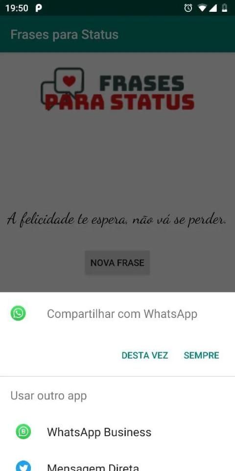 As frases são geradas automaticamente, e podem ser compartilhadas pelo Whatsapp, Facebook, etc...