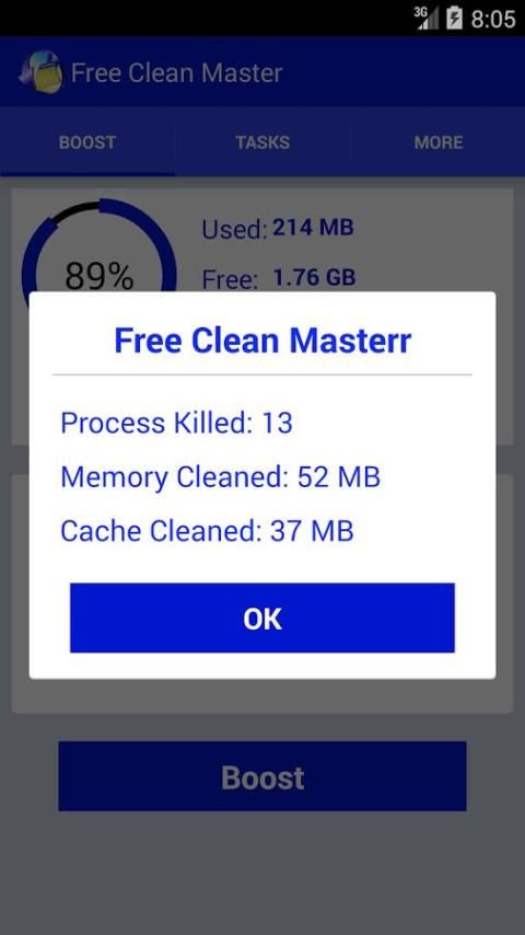 Free Clean Master is tool to clear Your RAM Memory, Boost your android, free more RAM space to perform other application well, Delete cache and residual files to reclaim storage to make it clear and more faster.