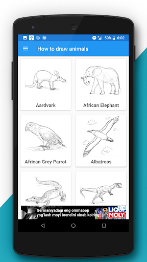 There are many different animals drawing you can find in game like fish, ostrich, tiger, butterfly, kiwi bird, parrot, hippo, chicken, polar bear, horse, walrus, monkey, monk seal, manta ray, hammerhead shark, koala, elephant, camel, cow, donkey, armadillo, rhinoceros, rabbit, puffin, dog, cat, dolphin, kangaroo, snail, and eagle. Download this app and let your kid learn how to draw.