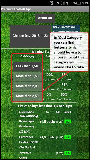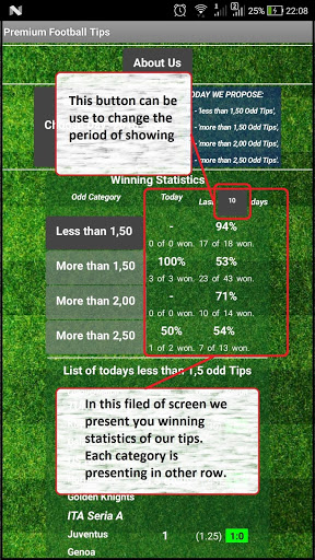 The most successfull betting football sport tips ever. In application you can find winning predictions devided by category. This app offered you only one category of tips. We are making it by the advanced mathematics analysis based on:
