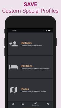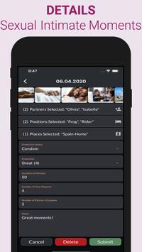 This sex tracker app lets you track sexual activities, sex life, sexual health, sexual intimacy and gives you sex statistics about your private life for better sexual wellness.