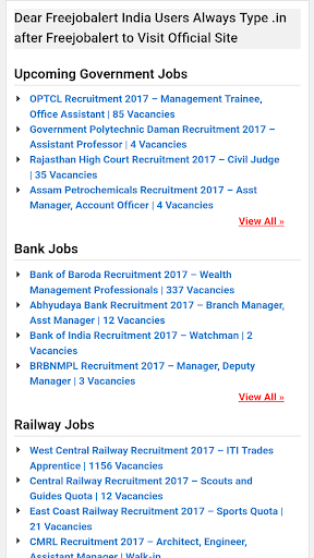 Free Job Alert provides Job Alerts for Government jobs and Freshers jobs. Recruitment news in Bank and Private Sector Jobs and Railway Jobs or Defence Jobs in India and Sarkari Naukri Jobs.