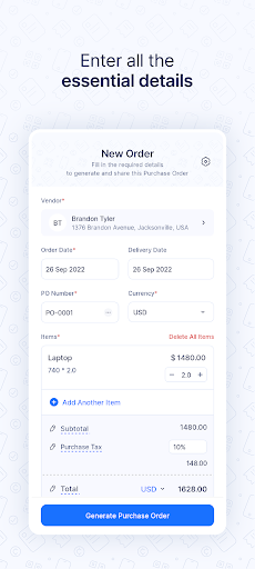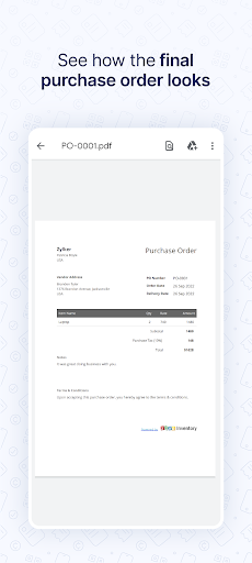 Zoho Inventory's purchase order generator app helps you create quick and professional purchase orders at any time from anywhere. Simply fill out the template and share the PDF with your supplier online, or save a copy of it on your device.