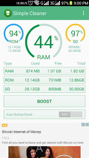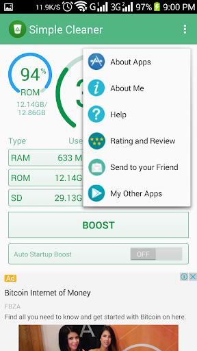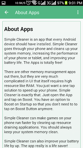 There are other memory management apps out there, but they are very much complicated in UI that itself requires high resource like RAM. You just want a one tap solution to speed up your phone. Simple Cleaner is exactly that. Just open the App and tap on Boost. You have an option to Boost on Startup so that you don't need to to tap on Boost Button anymore.