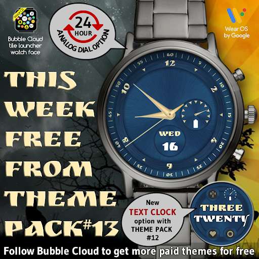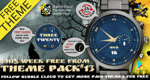 If you like the week's theme, you are encouraged to install the theme pack which contains it. This week's free theme is from Theme Pack #13 with 4 12/24 hour analog watch faces: https://play.google.com/store/apps/details?id=dynalogix.bubblecloud.themepack13 (price just $1.19)