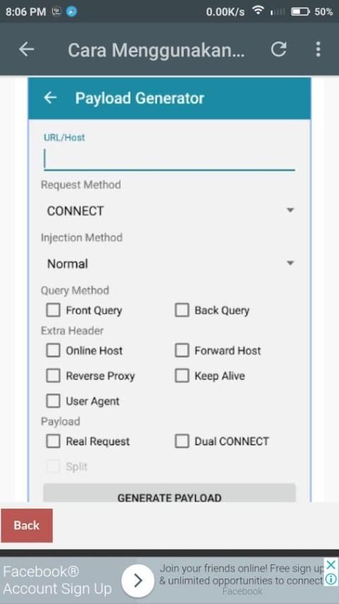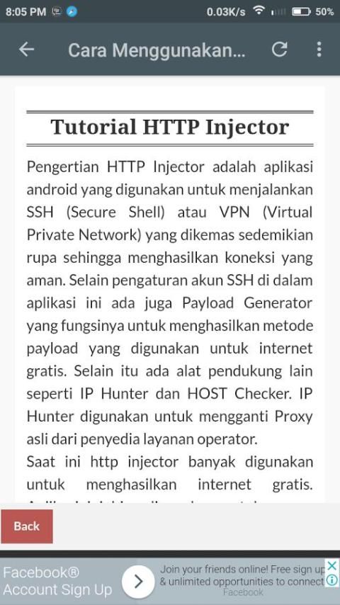 HTTP Injector is android application that is used to run SSH (Secure Shell) or VPN (Virtual Private Network) that is packaged so as to achieve a secure connection. In addition to SSH account settings in this application there is also Payload Generator whose function is to generate payload method used for free internet. In addition there are other supporting tools such as Hunter and HOST IP Checker. IP Proxy Hunter is used to replace the original operator of the service providers.