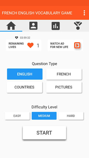 EVOG - French English Vocabulary Game is the most advanced and entertaining vocabulary game with its contemporarily designed game interface and constantly updated word database, it is easier than ever to improve your vocabulary knowledge with questions in 4 categories (English-English, French-English, Countries-English and Pictures-English) and different difficulty levels.