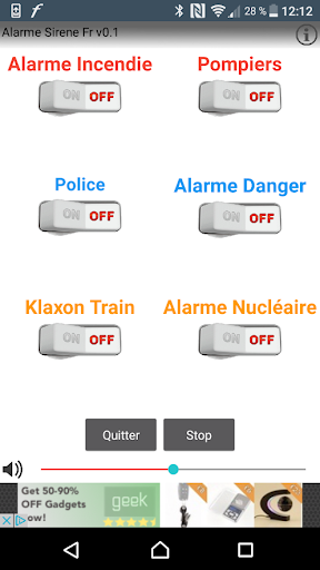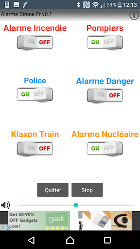 Find all the French alarms in the same application: * Fire alarm * Firefighters * Police * Danger alarm * Samu * Horn boat * Train Horn * Nuclear Alarm All of them can be launched at the same time!