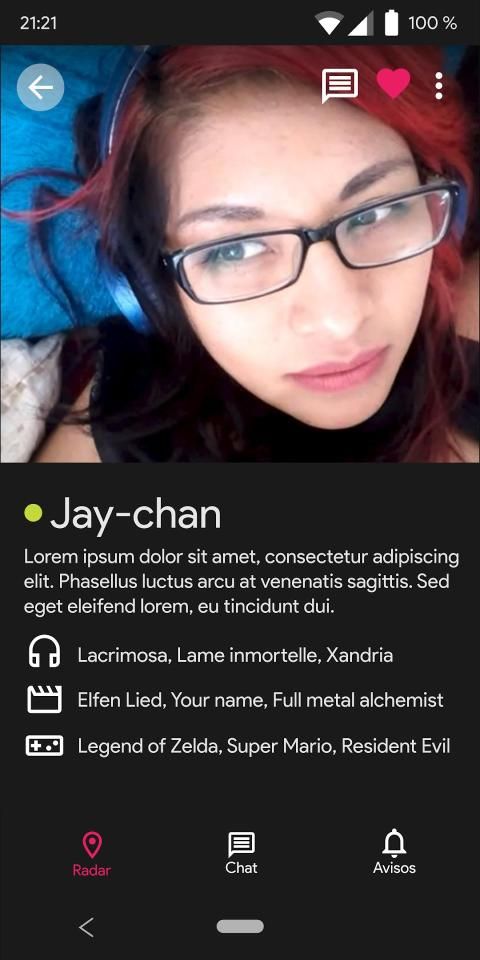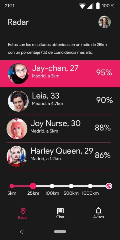 - Encuentra a usuarios por afinidad y distancia a tus gustos gracias al radar.