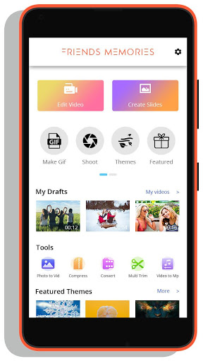 Friends Pics Video Maker or Editor helps you to create beautiful Friends Pics of some great moments or memories videos for your loving ones from photos and music with Friends Pics video themes.