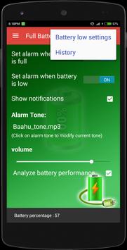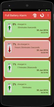 > This app, Full Battery Smart Alarm provides history of the mobile's battery status. It shows the charge and discharge time of the battery, will show all the records of the status of battery. This app has custom sound alarms also displays notification of the battery status.