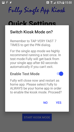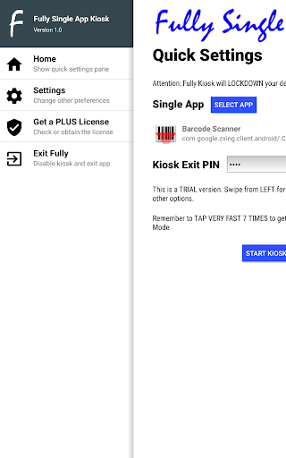 Fully Single App Kiosk is very easy to use. Select an app and start a Kiosk Mode within few seconds. Not every app likes to be locked in the kiosk but 99%. We recommend enabling the integrated Test Mode for the first try. If something goes wrong and you can't exit it will get you back after 60 seconds automatically. You can also allow other apps to start by adding them to the App Whitelist in Settings. There are 100+ other options available for each usage scenario.