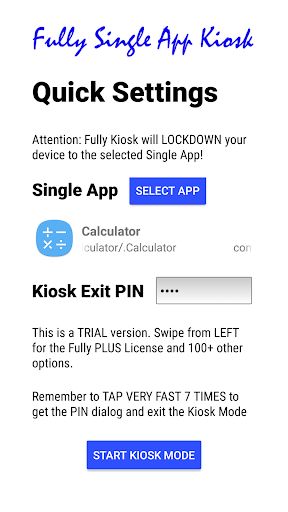 When Fully Single App Kiosk is launched SWIPE FROM THE LEFT EDGE to show menu and settings. When the Kiosk Mode is activated TAP 7 TIMES VERY FAST in order to see the PIN dialog.