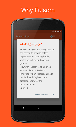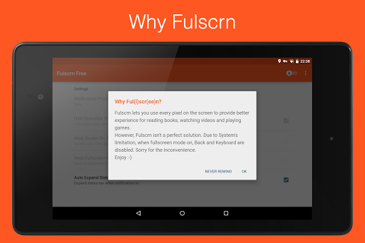 However, Fulscrn isn't a perfect solution. Due to System's limitation, when fullscreen mode on, Back and Keyboard are disabled. Sorry for the inconvenience.