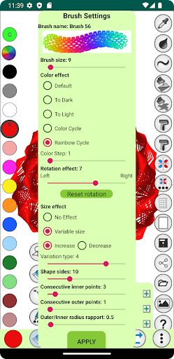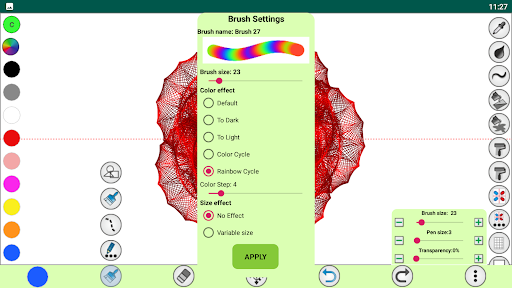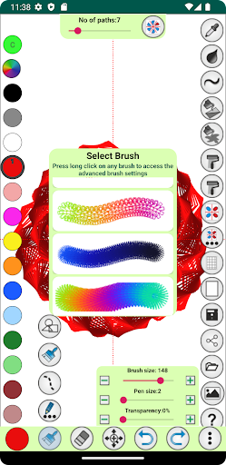 You can draw a beautiful mandala from a few easy touches. It is custom configurable in 4 modes vertical, horizontal, both and radial with maximum 30 paths. Can be used together with Blur, Emboss, Fill, Gradient shader, Image Shader effects, any Drawing brush, any line style and Drawing Shapes. When using Gradient shader effect now you can choose to center the radial gradient to the symmetry axis.