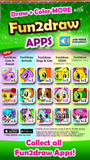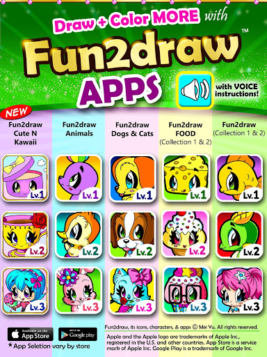 Fun2draw, Fun2draw apps, their logos, drawings, designs, characters, characters' distinctive likeness, and audio belong to Mei Yu, and are protected by Copyright and Trademark Laws. Fun2draw apps are for personal, home use only. Any commercial use is strictly prohibited. Please report any copyright or trademark violations to Mei Yu through the email address above.