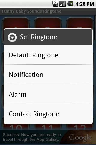 Funny Baby Sounds Ringtone containshigh quality baby sounds. You will love these funny baby sounds. Crying baby, laughing baby, singing baby, playing baby, remix baby, rap baby, japanese baby, chinese baby, Indian baby, cute baby and more. Enjoy these funny baby soundsFrom the makers of the best ringtone applications on the Android Market, did it againEnjoy these funny ringtones