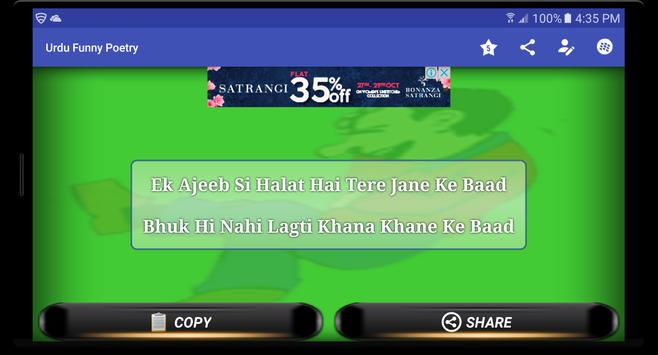 This app contains huge collection of best funny poetry in urdu / hindi language. Spread funny urdu / hindi shyari messages and status updates in your family and friends. Both copy and share features available for easy sending to friends. All latest 2018 funny shayari (poetry) collection in one application.