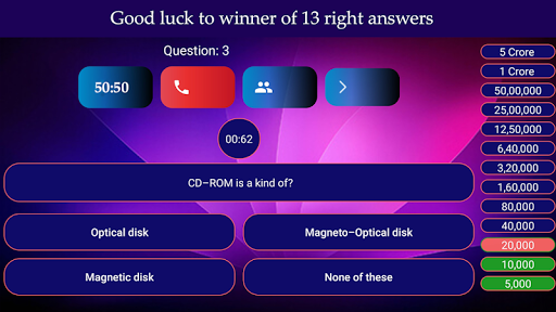 ~ KBC Play: It's a very Interesting Game to Play or enjoy in your mobile or tablet. About Game, Available various question(40) with options (4) and You can choose any one option. Including Here are available 4 lifeline ( Fifty-fifty-50:50, Phone to your friend, Audience, Move-True answer) and many more to come.