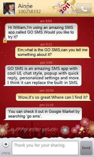 ***!!! After install GO SMS, you may appy this Happy New Year theme in GO SMS's "Settings->Apprearance Settings->Theme selection".Thanks, enjoy it.